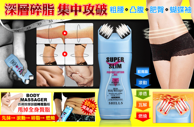 Description : Shills SUPER SLIM 150ml Intensive anti-cellulite massage system. 3Xs Anti cellulite essences + 2Xs firming ingredients + 360 degree roller that breaks down fatty deposits