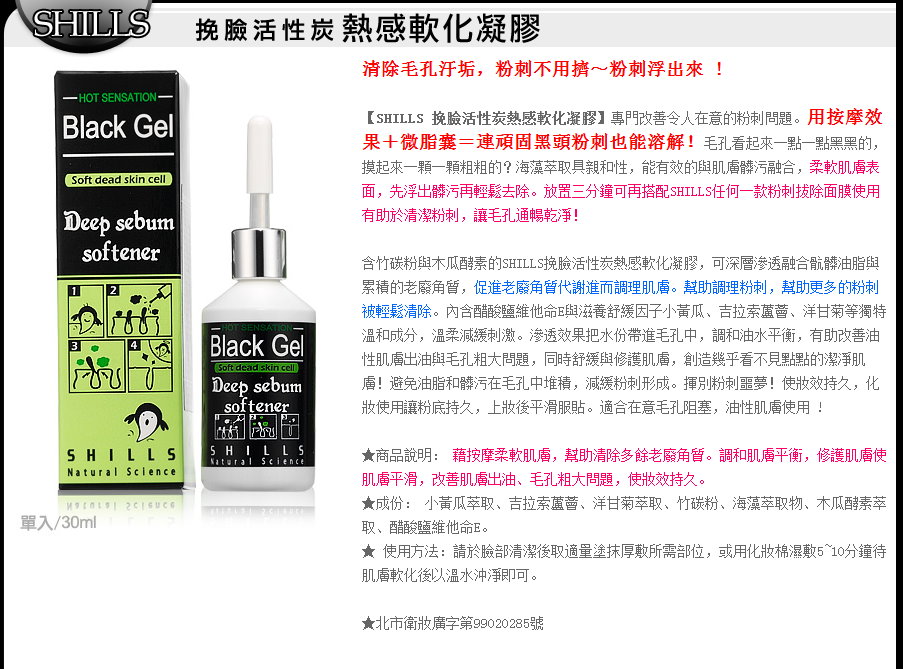 SHILLS Black Gel Deep Sebum Softener, specializes on improving common skin problems such as sebum, acnes and blackheads. Combining massage plus Gel Liposomes to soften even the most stubborn blackheads.