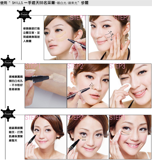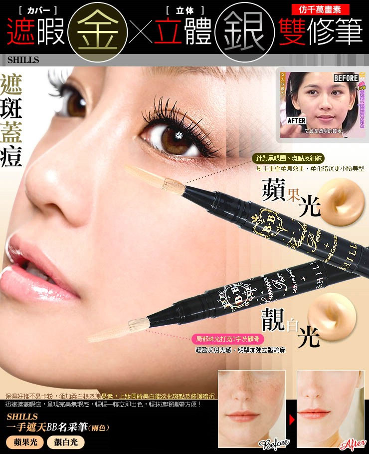 Description : Shills BB Luminous Concealing Pen ( 2 pcs per box)遮蓋斑點、修飾痘疤,將暗沉斑點隱形,輕輕一點讓肌膚質光彩耀眼! SHILLS一手遮天BB名采筆-具高度遮瑕功能,採水解大豆蛋白、角鯊烯及水解彈力蛋白成份,保濕好推不易卡粉,並添加桑白根及熊果素,上妝同時保養,能淡化斑點及修護暗沉,嫩白水潤肌膚,靚白光筆適合用於眼部、T字、鼻翼兩側等,蘋果光筆可修飾雙頰並可用於局部黯沈肌膚,讓膚色更明亮創造立體臉龐!迅速遮蓋不完美肌膚,呈現完美無瑕感,輕輕一轉,立即出色,輕抹遮瑕,攜帶方便!
