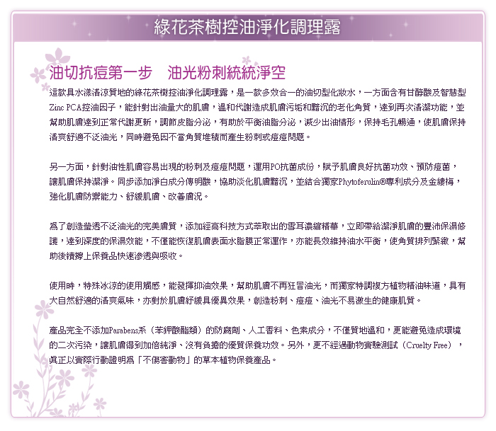 這款綠花茶樹控油淨化調理露特別針對油性膚質或青春痘肌膚設計,可以有效代謝肌膚表面老廢角質,