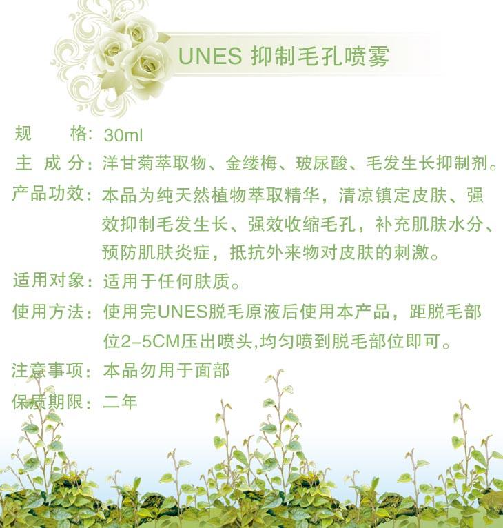 粗毛BYE BYE,毛毛不再长 脱毛后清洗脱毛部位 立即喷本喷雾 可使毛毛延长到一个月后才长出来哟 UNES脱毛原液最佳伴侣----UNES毛孔抑喷雾!