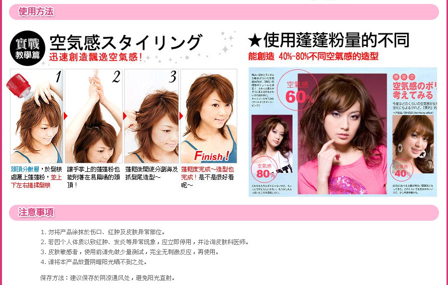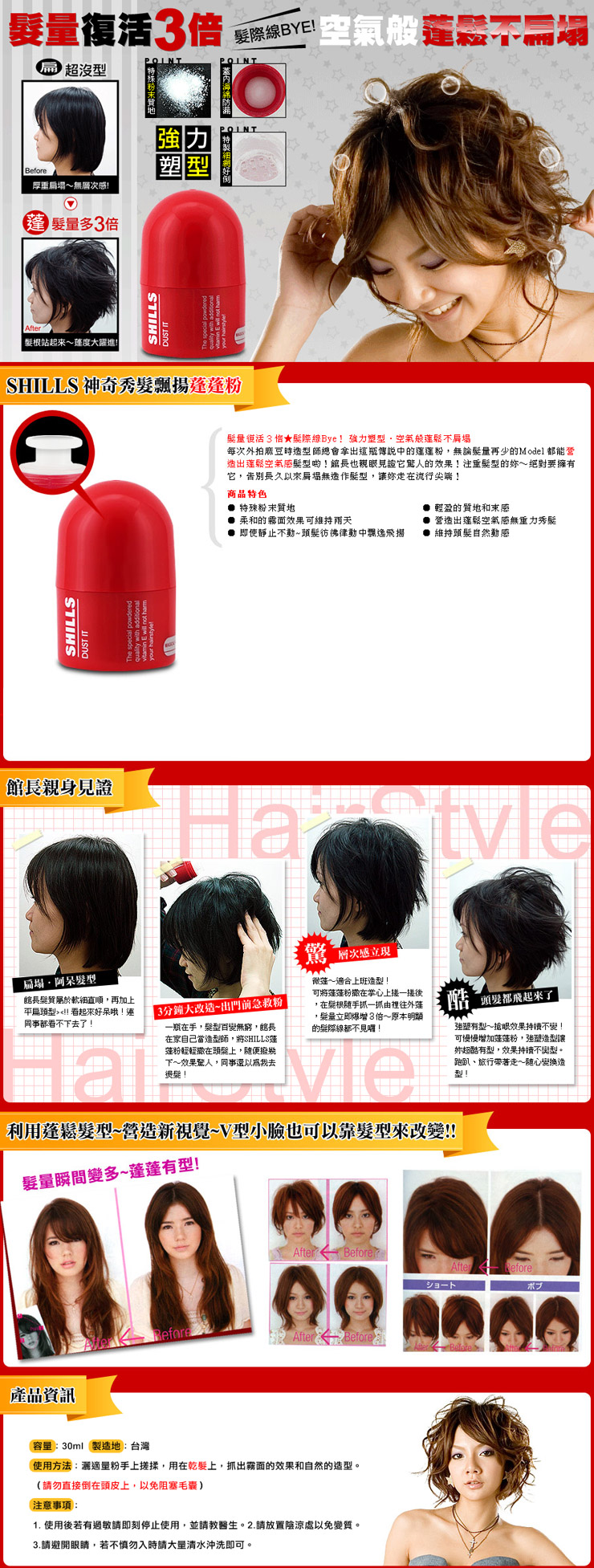 Description : 发量涨3倍哦 !发迹线再见啦!強力塑型.空氣般蓬鬆不扁塌 少的Model都能營造出蓬鬆空氣感髮型喲!!館長也親 眼見證它驚人的效果。