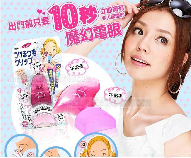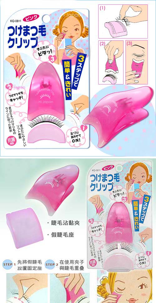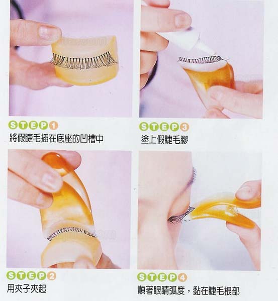 这个小工具的用法,把假睫毛修剪好,放进小夹子,理顺,把根部留在外面。 在根部涂上胶水。在自己的睫毛根部也轻轻涂一道胶水。 眼睛尽量闭起来,另一只手轻轻拉紧眼皮比较好,把假睫毛往眼睛上放, 然后松开夹子,把睫毛两端再按按牢,防止翘起。 用手把睫毛向上顶一顶,它就不会塌下来了。 再刷上睫毛膏,把真假睫毛粘到一起,用电卷器烫一下更好。一定不要出现两层睫毛哦! 用手把睫毛向上顶一顶,它就不会塌下来了。 再刷上睫毛膏,把真假睫毛粘到一起,用电卷器烫一下更好。一定不要出现两层睫毛哦!