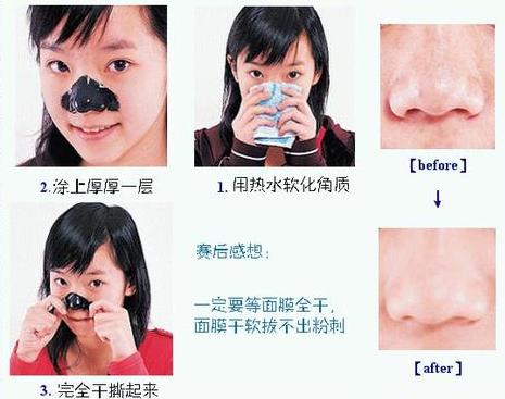 从下往上轻轻揭下,即可看到黑头,酒米,污脂,死皮全被吸出。 (建议每周1-2次)。 注意事项: 皮肤出现红肿,湿疹,粉刺发炎,疮和对皮肤过敏者,禁止使用。 鼻头,油垢,脏东西,统统清除!