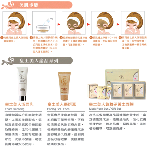 用 法:清潔臉部後,將皇土美人面膜倒入碗中,利用量杯加入7~8公克的水或化妝水,均勻攪拌成膏裝,塗抹肌膚上(請避開眼睛周圍),待半乾後,再以清水沖洗掉面膜,再用洗面乳清潔一次,即完成敷臉,之後請繼續一般日常保養步驟。