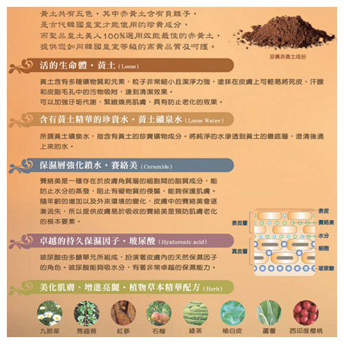 主要成份:韓國黃土、保溼因子、松葉精華、香草精華。