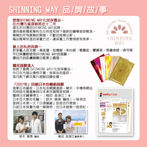 和梅果(09年日本最紅的美白成分) 首度添加了和梅果萃取精華在產品中,並運用它來避免角質細胞吸收黑色素,達到讓肌膚不變黑的目的,最快的美白方式就是所使用的美白產品要能由內在開始抑制、阻斷黑色素形成的路徑,並從表面代謝、淡化黑色素及斑點,就能達到最佳美白效果。同時也是09年日本最火紅、大小品牌都在瘋的新美白成分。 白黎蘆醇 白黎蘆醇的功能可增強C的利用,使皮膚代謝良好,預防黑色素囤積,是天然防曬物質,美白、護膚、更白皙潤澤,保護肌膚免紫外線荼毒,並預防膠原蛋白、彈力蛋白退化,使肌膚更緊實、更年輕。 西印度櫻桃、維他命C 淨化肌膚掃除黯沉,能深入肌膚底層,幫助還原黑色素,美白淡化肌膚。 水解蠶絲蛋白 在醫療上膠原蛋白雖然已廣泛被使用。但此類膠原質因分子量較大,較不易為皮膚所穿透,必須借由長時間敷臉或導入幫助加強吸收。蠶絲親水性極佳,為天然的調節因子,特佳的保濕性;能鎖住肌膚水份防止乾燥、脫妝,並能預防黑色素形成。 金縷梅萃取液 為榛樹之天然萃取液,具舒緩、收斂、鎮定肌膚作用,能有效調節皮脂分泌、平衡油脂分泌量。 薏仁 含有相當多的蛋白質與油脂、維生素 B1、B2,以及鈣、鐵、磷等礦物質。其中蛋白質能分解酵素,軟化皮膚角質,使皮膚光滑。另外,薏仁可促進體內血液和水分的新陳代謝。 ★主成份 C60富勒烯、白藜蘆醇、和梅果萃取、葡萄柚萃取、維生素C、薏仁萃取、金縷梅萃取、西印度櫻桃、七葉樹萃取、山毛櫸芽孢萃取、甘草萃取液、維生素E。 ★面膜創新材質 新面膜布材質,由蠶繭所抽出的蠶絲纖維與純棉交織而形成的多層次蠶絲布,具無菌、多孔性、親膚性、吸濕性與透氣性等多種優秀的特質,能與精華液緊緊貼合,極速將有效成份傳遞進入肌膚深層使之吸收 ; 美國聯邦政府更是極力推薦民眾使用這種親膚性極佳的蠶絲布作為嬰幼兒衣物的主要材質。 ![]() ![]() ![]() ![]()