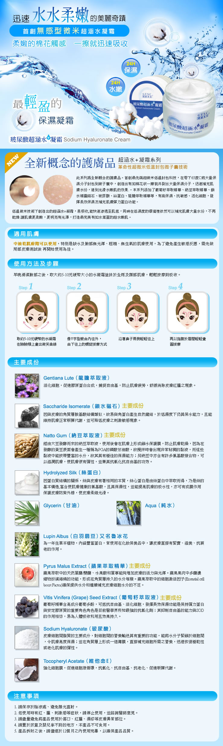 本系列添加了葡萄籽萃取精华,纳豆萃取精华,锁水精灵磁石,玻尿酸,丝蛋白,龙胆萃取精华等,有高保湿,抗敏感,活化细胞,发挥长效保湿及补充肌肤弹力蛋 白功能.低温微米技术下创造出的超涵水+凝霜,易吸收,能快速渗透至肌底, 同时在低湿度的环境里依然可以补充肌肤大量水份,不再干燥.让肌肤更柔嫩,更明亮有光泽,打造最完美有如水煮蛋的超水嫩肌.