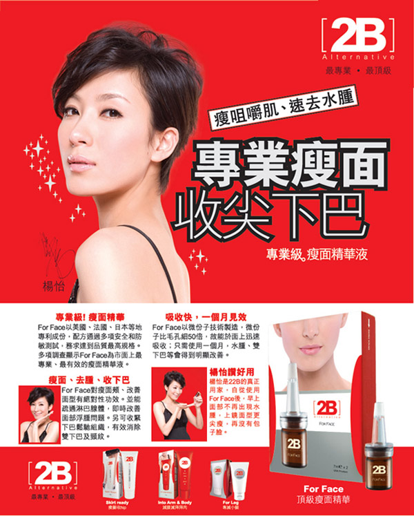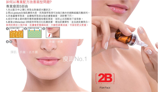 如何以專業配方改善面型問題? 使用2B For Face專業瘦面精華2-3個月後,肌膚會更緊緻貼面,大臉型逐漸消減,面容更尖更瘦。使用方法每天一次,於潔臉後在兩邊面脥及下巴位置,各塗兩滴,並以食指和中指,由下向上輕力按摩至完全吸收即可。 注意事項: