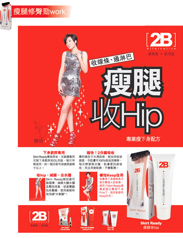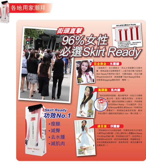最新2B Skirt Ready,了解现今女性之需要,推出最全面、最专业的美腿配方,一支即能有效瘦腿、控毛、白滑、去水肿、通淋巴,令妳由hip位靓到落脚踭。瘦腿