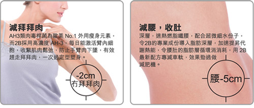 AH3類肉毒桿菌毋須注射,為市面最有效外用瘦身元素,而2B減腰、減臂配方,採用高濃度AH3,能每日收緊肌肉組織,深入皮膚底層,激活及暢通淋巴管道,防止手臂肉下墜,有效幫妳趕走拜拜肉,並由於其獨有緊膚效能,令妳瘦身之餘唔會出現橙皮紋,達致完美瘦身效果。