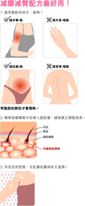 特別加入綠茶香薰精華,晚上於小腹上使用,配合打圈按摩手法,熱力會使香薰精華慢慢滲入,剌激大腸蠕動,促進排毒作用,而香薰精華亦能有效去除腰及手臂的水腫問題。