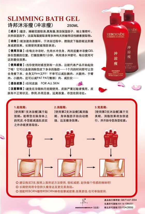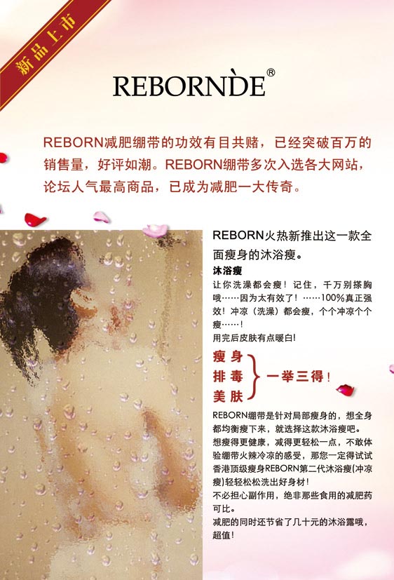 REBORN绷带是针对局部瘦身的.想全身都均衡瘦下来,就选择这款沐浴瘦吧.想瘦得更健康,减得更轻松一点,不敢体验绷带火辣冷凉的感受,那您一定得试试香港顶级瘦身REBORN第二代沐浴瘦(冲凉瘦)轻轻松松洗出好身材!不必担心副作用,绝非那些食用的减肥药可比。