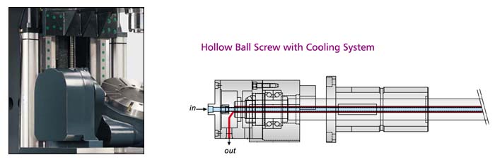 | | Oil cooling through ball screws on X, Y, Z axis minimizes thermal deformation and backlash, while ensuring smooth motion during rapid traverse. |