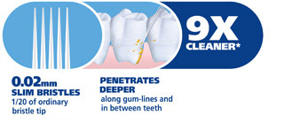 - Its 0.02mm bristle tip which is 1/20 the size of ordinary bristles enabling it to penetrate deeper along gum lines and in between teeth