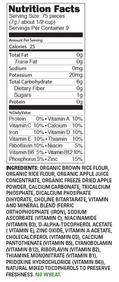 Description : Apple Happy Puffs are sweetened with 100% fruit juice and enriched with vitamins and minerals. Our puffs melt in Baby’s mouth and encourage self feeding. They may just buy Mom some quiet time, too.nutritional infoThe most accurate information is always on the label on the actual product. We periodically update our labels, and the website does not necessarily get updated at the same time. The values on the website are intended to be a general guide to consumers. For the most accurate information, please refer to the product itself. allergen infono wheat