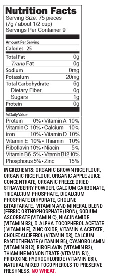 Description : Strawberry Happy Puffs are sweetened with 100% fruit juice and enriched with vitamins and minerals. Our puffs melt in Baby’s mouth and encourage self feeding. They may just buy Mom some quiet time, too.nutritional infoThe most accurate information is always on the label on the actual product. We periodically update our labels, and the website does not necessarily get updated at the same time. The values on the website are intended to be a general guide to consumers. For the most accurate information, please refer to the product itself. allergen infono wheat ![]()