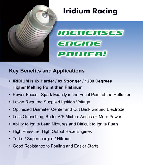 Description : PERFORMANCE FEATURES OF BRISK IRIDIUM RACING SPARK PLUG: ![]() Iridium is extremely durable material that extends the spark plug lifetime by reducing spark plug gap erosion. (Iridium/Yttrium series utilize Yttrium enriched spark plug ground electrode for increased durability – available in only some shell dimensions) Spark Plug Power Focus – spark plug spark is exactly in the focal point of the "tapered shell reflector" that helps direct air fuel mixture during the compression stroke to the center electrode and consequently, after spark ignition, the propagating flame front toward the center of the combustion chamber. Spark Plug Lower Required Supplied Ignition Voltage – is achieved by utilization of optimized diameter of the spark plug center electrode, along with sharp edges of the cut back ground electrode. This spark plug design is beneficial in applications where the stock ignition system is pushed to the limit in modified power applications and customer does not want to upgrade ignition system. Spark Plug Lower Required Supplied Ignition Voltage is also beneficial for easier cold starts and operation under partially fouled spark plug condition caused by A/F management problems or oil consumption. Spark Plug Optimized Center Electrode - Utilizing a 1mm diameter spark plug iridium center electrode, our center electrode is capable to displace more heat than smaller diameter tips used by other Iridium spark plug manufacturers. Brisk Iridium Racing Spark Plug cut-back ground electrode accumulates less heat, displaces heat more rapidly, and allows better access of A/F mixture to the spark and easier (less restricted) spread of the flame front.