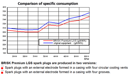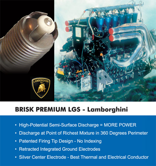Brisk Premium LGS spark plug has been developed in cooperation with Lamborghini Morori Marini. The spark plug utilizes extremely long glide-spark and massive integrated side electrode. Massive integrated side electrode ensures superior heat removal from active part of the spark plug. Extremely long glide spark (almost 3mm) protrudes deep into combustion chamber, carries more potential charge and is unshielded by the conventional side ground electrode. The air and fuel mixture is ignited more spontaneously and flame front spread is unrestricted and more uniform.