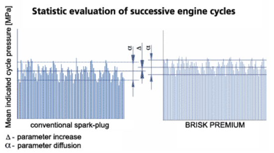 Ionization and spark-over occurs automatically together with an optimum composition of the fuel/air mixture. The spark plug gap is not shielded by the side electrode, so the mixture has unlimited access. Better mixture ignition, and thus higher combustion speed, and faster flame front spread, especially at the beginning of combustion, allows better fuel energy utilization. The subsequent increase in medium effective pressure in the engine cylinder and balancing of values of medium effective pressure during individual working cycles contribute to increased engine power.