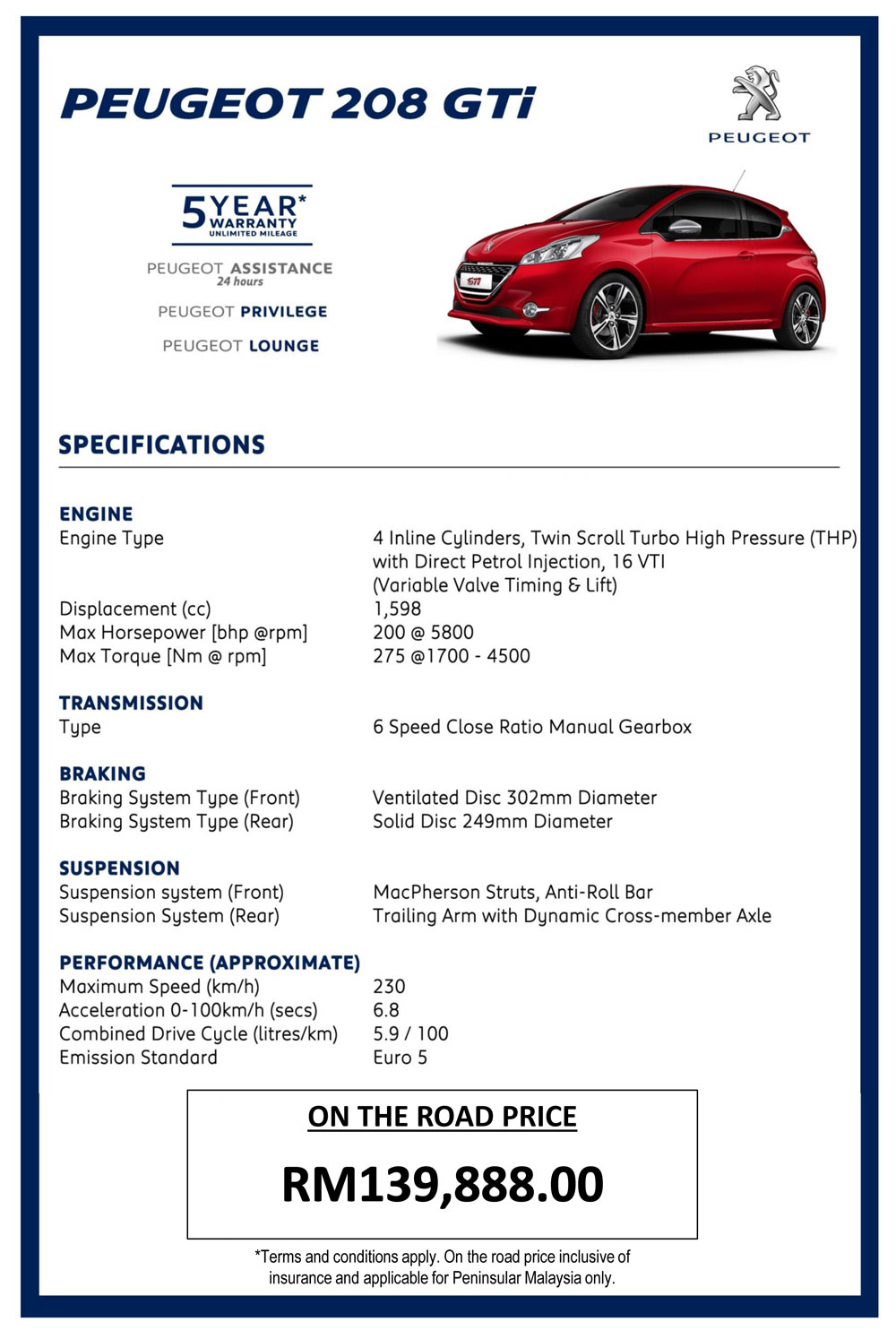 Description : The launch of the 208 GTi brings the Peugeot GTi legend right up-to-date. Feast your eyes on the dynamic contours and glistening chrome highlights of the tailgate and 3D grille engraved with dynamic Peugeot red. The remodelled headlights and the GTi’s signature rear spoiler add an exciting finishing touch. ![]()